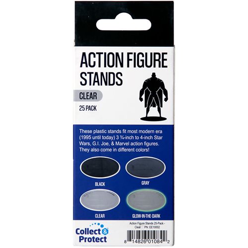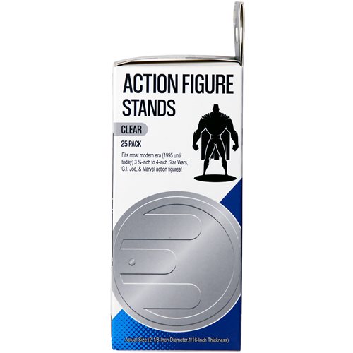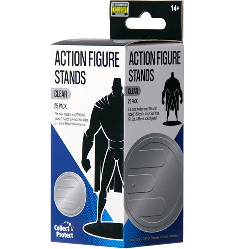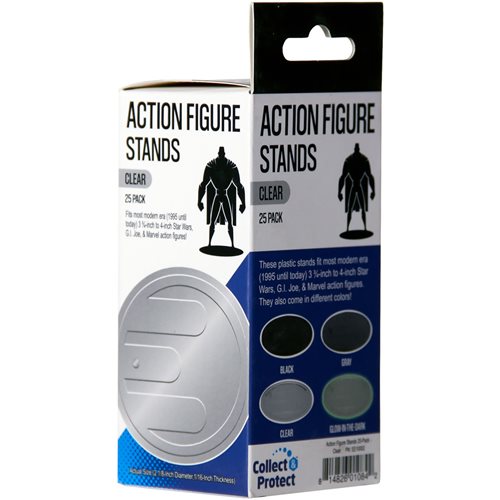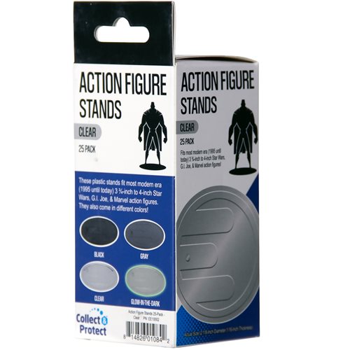 Give your figures the support they deserve! You’re gonna love these clear action figure stands! Extremely durable and handsome, these round platforms look great and are transparent, to blend in better with your shelves and dioramas. Each measures 2 1/8-inches in diameter and features a peg that fits snugly into your figure’s foot. Buy this 25-pack today and give your characters all the support they need and merit! Action figures sold separately.