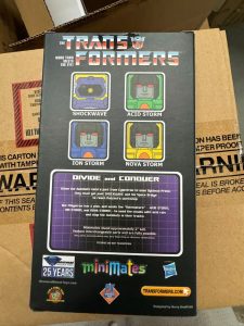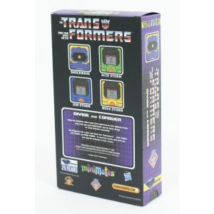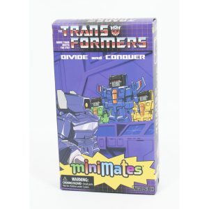 A classic episode of The Transformers comes to life in this box set of 2-inch tall figures! Decepticon Shockwave and his henchmen Acid Storm, Ion Storm, and Nova Storm (also known as the Rainmakers) are more than meets the eye with over 10 points of articulation each and fully interchangeable parts! With a Minimate-style cover illustration, this full-color “VHS” outer box features a removable “cassette”-style inner box. The Transformers Divide and Conquer VHS Minimates Box Set – SDCC 2024 Exclusive is limited to only 1,000 pieces! Ages 8 and up.